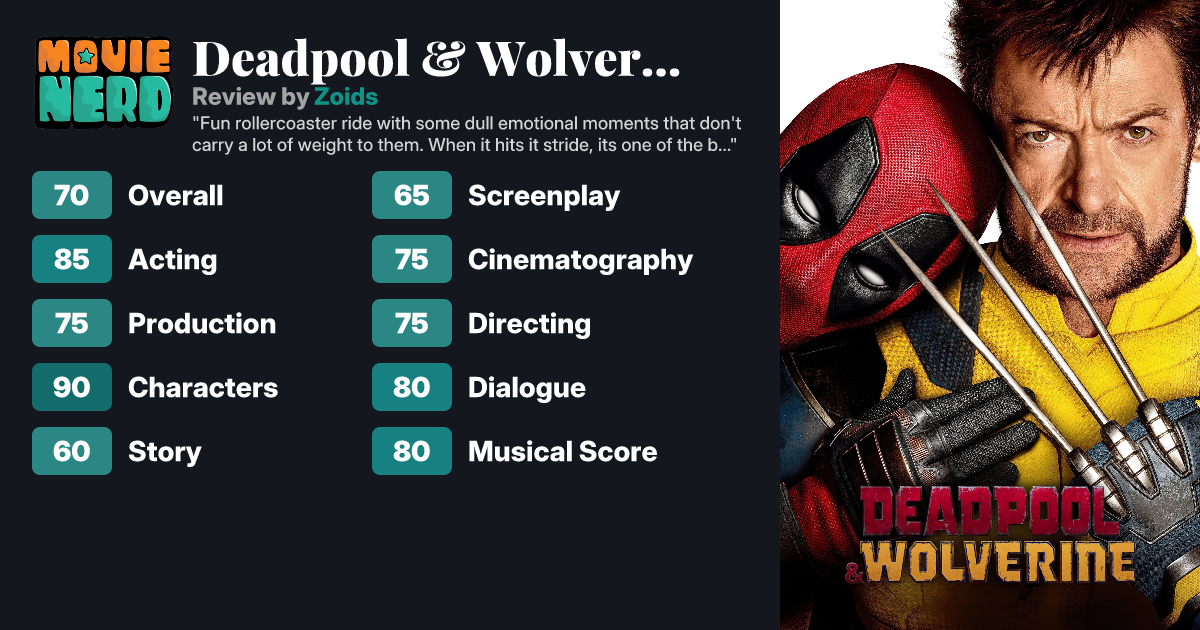 Fun rollercoaster ride with some dull emotional moments that don't carry a lot of weight to them. When it hits it stride, its one of the best Marvel movies and uses cameos in a more fun interesting way for the most part then others of the same vein. although when it doesn't hit, it feels like your watching the worst of the MCUs showcase, thankfully there is much more to enjoy then dislike here, the villain has some cool visual effects, Deadpool and Wolverine play off each other amazingly and the soundtrack is great, nice choices all-round.